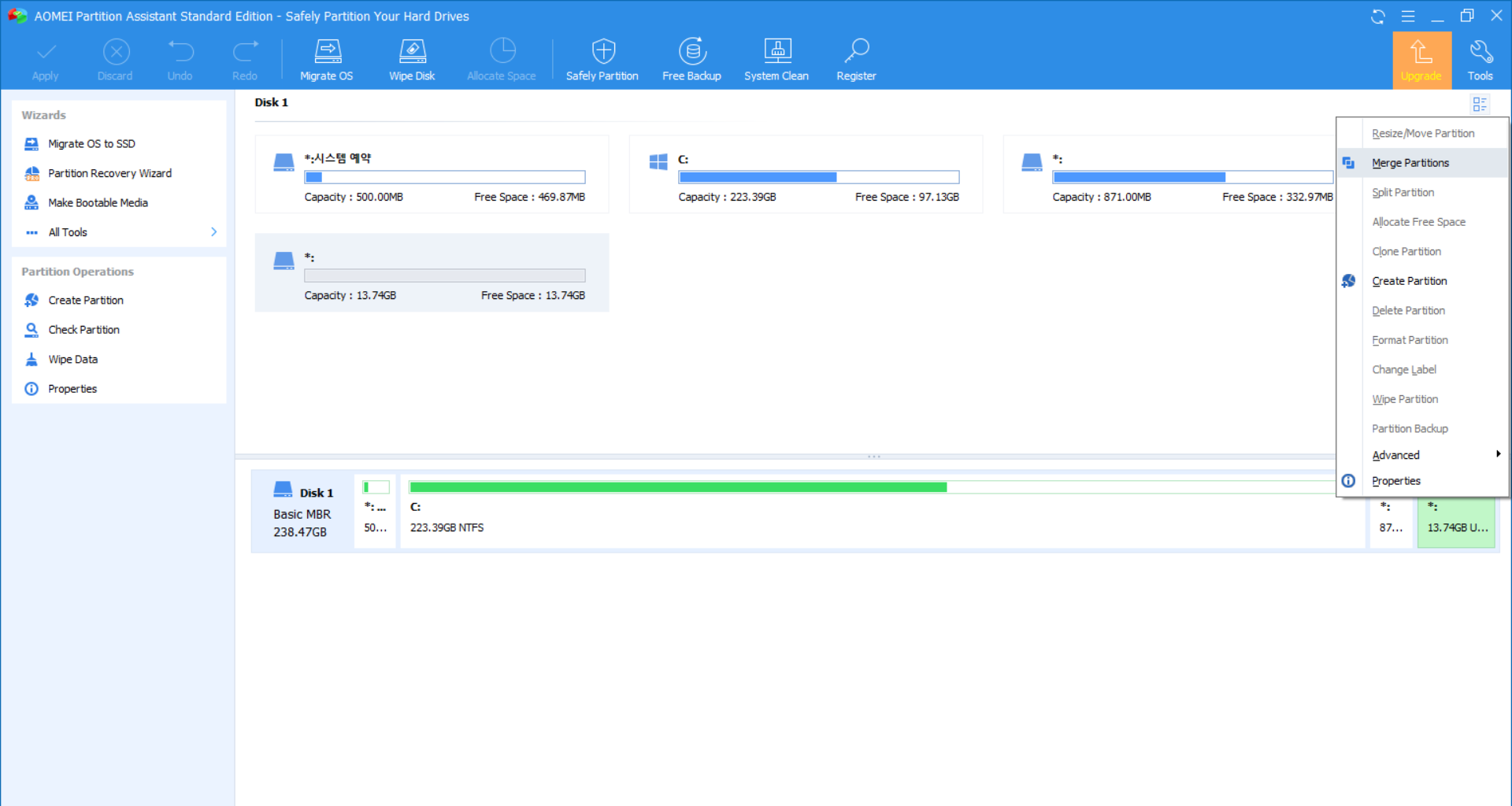 사용하지 않은 드라이버가 *로 표시되는데 오른쪽 마우스 눌러서 -Merge Partitions 눌러주세요.
